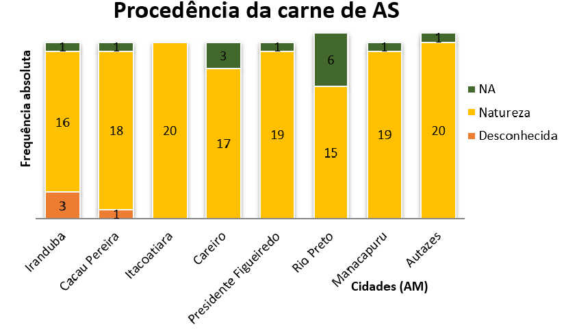 Para os entrevistados, a procedência da carne de AS comercializadas nas feiras-livres é da natureza, ou seja, não procedem de criadouros, evidenciando um forte indício de caça nessa região. Na cidade de Itacoatiara, por exemplo, todos os entrevistados confirmaram isso (20 citações). Nas cidades de Iranduba e Cacau Pereira, desconhece-se a procedência da carne (03 e 01 citações, respectivamente). Com exceção de Itacoatiara, todas as outras cidades pesquisadas, alguns entrevistados não souberam ou não quiseram informar (NA) a procedência da carne de AS comercializada na localidade (Figura 7).