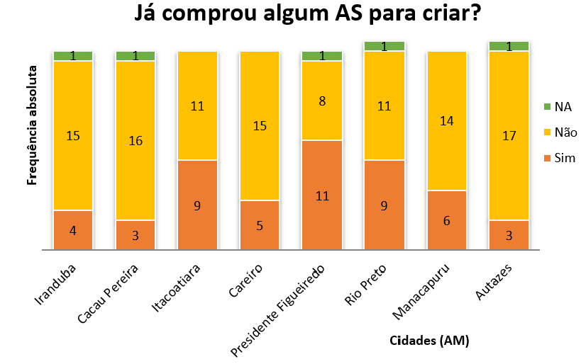 Aos entrevistados, quando se perguntou se já comprou algum AS para criação doméstica, houve certo equilíbrio nas respostas positiva e negativa. Isso é evidente na cidade de Itacoatiara (11 citações para não e 09 citações para sim). Em Presidente Figueiredo, o número de entrevistados que compraram AS para domesticar (11 citações) foi superior aos que não compraram (08 citações), diferenciando das cidades de Iranduba, Cacau Pereira, Careiro, Manacapuru e Autazes, em que a resposta negativa foi maior que a positiva (Figura 8).