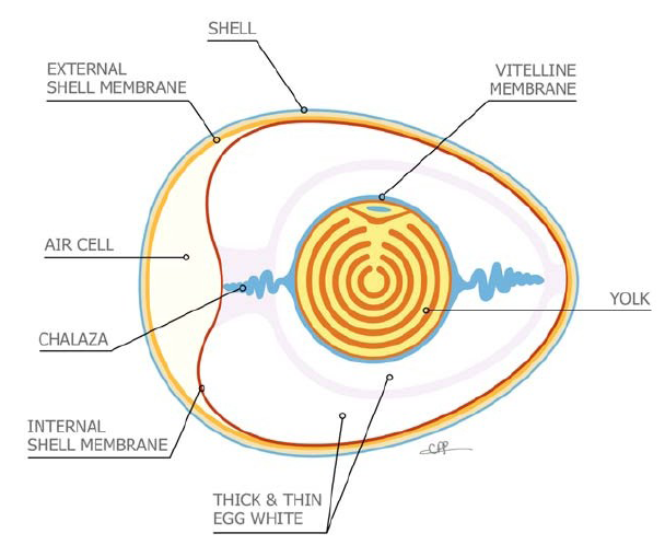 En su interior contiene una yema concéntrica o vitelo, rodeada por la chalaza, cuya función es mantenerla en el centro y que tiene contacto directo con la clara, como se observa en la figura 1.