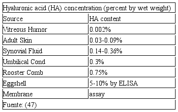 Un claro ejemplo de lo anterior es lo reportado por los inventores de la patente “Therapeutic, nutraceutical and cosmetic applications foreggshell membrane and processed eggshell membrane preparations”, como Long, Adams, DeVore y Franklin en el 2004, donde se compara el contenido de HA con otros tejidos, ver Tabla 1. (47).