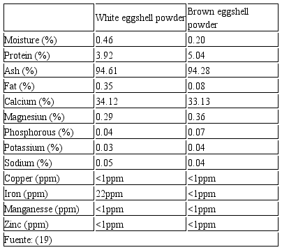 La cáscara contiene, además, componentes minoritarios como carbonato de magnesio 1%, fosfato de calcio 1%, materia orgánica entre 3,5% y 4% como glicoproteínas y proteoglicanos, fracciones ricas en arginina y glutamina (25). Este biomaterial además contiene boro (B), estroncio (Sr), cobre (Cu), hierro (Fe), manganeso (Mn), molibdeno (Mo), azufre (S), silicio (Si) y Zinc (Zn), los dos primeros elementos sumados al alto porcentaje de calcio (Ca), son fundamentales en la prevención de la osteoporosis (26), a pesar de contener elementos pesados como el plomo (Pb), Aluminio (Al), cadmio (Cd) y mercurio (Hg), pero en valores mínimos permitiendo su uso en suplementos dietarios (15).