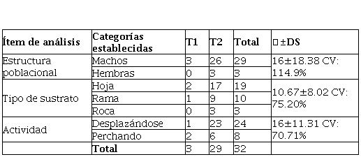 La LRC varío entre 20.1 y 35.4 mm (=24.66±3.55 mm), entre 20.1 y 27.96 mm para machos y entre 30.1 y 35.4 mm para hembras. La distribución vertical fue entre 20 y 250 cm de altura (=127.96±64.6 cm). En T1 fue entre 30 y 120 cm (= 90±51.96 cm). En T2 fue entre 20 y 250 cm (=131.89±65.25 cm). La distribución horizontal fue entre 20 y 1000 cm (=275.06±225.32 cm). En T1 fue entre 100 y 300 cm (=183.3±104.08 cm). En T2 fue entre 20 y 1000 cm (=284.55±233.3 cm).