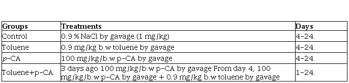 Experimental animals & design. In this study, a total of 32 male 10-12 weeks old Sprague-Dawley rats weighing approximately 200-300 g were divided into four groups of 8 animals each (Table 1). All animals were given ad libitum pellet feed and water. The doses of toluene (5) and p-CA (14,15) to be given to animals were determined in the light of previous studies. The study was terminated at the 25th day. All animals were anesthetized with 2-3% isoflurane (inhalation). The animals were euthanized by cervical dislocation under anesthesia. Blood and tissue samples were collected.