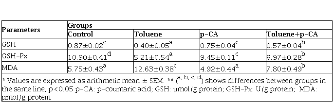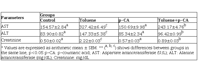 Significant (p<0.05) increases in serum AST and ALT activities, and creatinine level were detected in toluene group compared to the control. In the toluene+p-CA group, significant (p<0.05) decreases in the activities of AST, ALT and level of creatinine, which were increased when toluene was administered alone, were determined. No significant changes were found in the group where p-CA was administered alone compared to the control (Table 2).