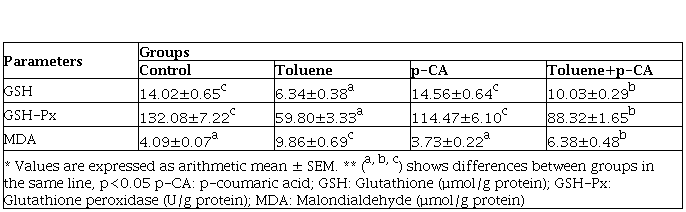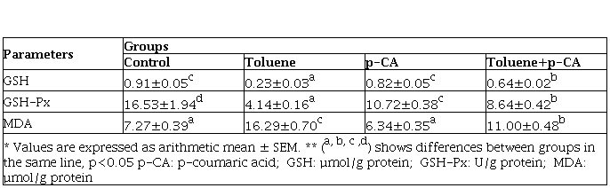 The liver is the primary organ in which drugs and xenobiotics are primarily metabolized. In the present study, significant (p<0.05) decreases in GSH level and GSH-Px activity; a significant (p<0.05) increase in MDA level were detected in liver samples of toluene group compared to control. In previous studies (22, 23, 24, 25) it was emphasized that toluene causes decrease in the efficiency of the antioxidant systems and increases lipid peroxidation in liver tissues. Mattia et al (22,23) administered toluene (1.5 mg/kg intraperitoneally) to rats and detected a significant (p<0.05) decrease in GSH level and increase in MDA level in the liver tissues. El-Nabi Kamel and Shehata (24) gave toluene (650 mg/kg single dose) to rats and found a significant (p<0.05) increase in MDA level and decrease in GSH level in the toluene group. Tas et al (25) reported that liver MDA level in the toluene group were significantly (p<0.05) higher than in control group. In the present study, in liver samples significant (p<0.05) increases in GSH-Px activity and GSH level and decrease in MDA level were detected in toluene+p-CA compared to toluene group. There are studies in which p-CA is used as a protector against oxidative damage induced by different agents. Similar to the current study, p-CA in liver tissues increased GSH levels and GSH-Px activities, and decreased MDA levels in previous studies (26,27,28).