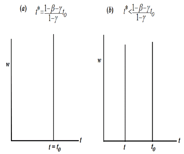 Con base en la expresión (19) se tiene que siempre que el factor de interés sea igual a uno, (1 + r) = 1, el mercado de bienes estará en equilibrio, independientemente de cuál sea el valor del salario. La razón de esto es que en estado estacionario nada cambia, en consecuencia, el precio del producto de hoy es igual al precio del producto de mañana, por lo que el precio relativo inter temporal es igual a la unidad. Lo anterior implica que la tasa de interés es cero ( r = 0). 6