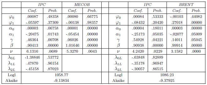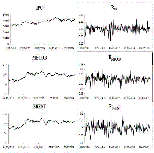 To describe the marginal behavior, we use the closing prices of the Mexican stock index and two different oil prices: MECOB crude oil prices (for the Mexican reference crude) and BRENT prices subscribed i at time t, Pit Continuous returns are calculated as follows: