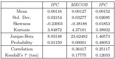 The non-normality of returns is confirmed for the IPC and MECOB, but not for BRENT, by the Jarque-Bera statistic based on kurtosis and skewness. The correlation coefficient is a measure of linear dependence. If this value is one, there is a perfect positive linear dependence, and if it is negative one, there is a perfect negative linear dependence. The 36% positive linear correlation between IPC and MECOB returns, and the 25% positive linear dependence between IPC and BRENT returns, confirms a level of linear dependence. The Kendall’s τ (tau), explained in section 3, confirms the dependence between the IPC and oil price returns.