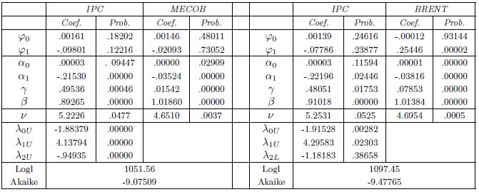 On the other hand, the Gumbel model shows a higher probability that the increases observed in the Mexican stock returns were caused by increases in oil returns. The effect is more volatile and present, and shows autoregressive behavior, since the parameters of the equation for upper tail dependence in Gumbel are statistically significant. This probability varies in the study period, ranging from 11.4% to 55.5%; in the case of MECOB, and from 7.5% to 39.5% for BRENT.