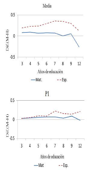 Como ya se mencionó, un resultado que destaca en la literatura es el mayor puntaje de los niños en los exámenes de matemáticas y menor en los de español, en relación con los resultados obtenidos por las niñas (Feingold, 1988; Hedges y Nowell, 1995; Guimaraes y Sampaio, 2008; Fryer y Levitt, 2010; Cornwell, Mustard y Van Parys, 2013).6 Este resultado influye en la brecha de salarios observada entre hombres y mujeres en la edad adulta. Por ejemplo, Murnane, Willett y Levy (1995) encuentran que los resultados de las pruebas de matemáticas de las personas en el nivel medio superior tienen impactos sobre los salarios que tendrán al graduarse.