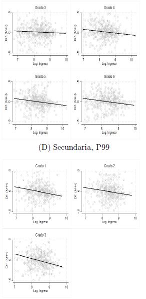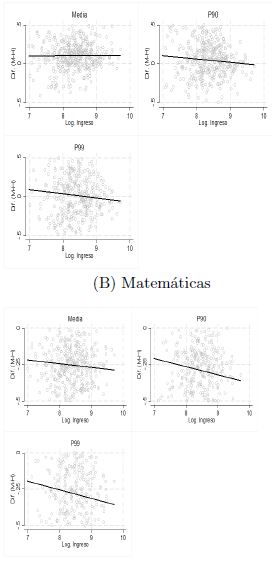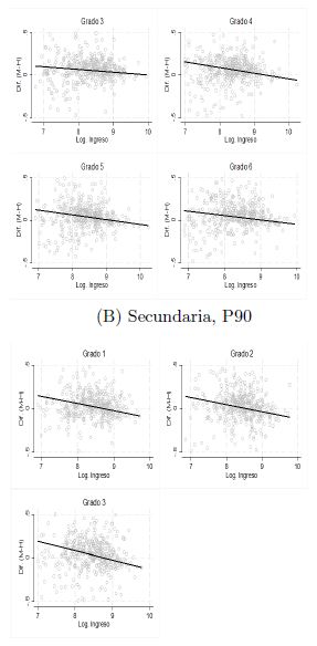 Dado que encontramos que los niños superan a las niñas en las pruebas de matemáticas en la parte alta de la distribución, en la gráfica 10 trazamos la brecha entre niñas y niños para los percentiles 90 y 99, como función del ingreso per cápita de los municipios, para analizar si la riqueza tiene algún efecto en la diferencia observada. Se puede notar que existe una relación negativa entre la brecha del puntaje y el ingreso, lo que indica que para los niveles de ingresos altos se pronostica que los niños superan a las niñas en matemáticas. Los efectos son más grandes que los encontrados en la media.22 Para el nivel medio superior, la relación negativa estadísticamente se mantiene, con efectos de -0.057 en el percentil 99 y de -0.032 desviaciones estándar para el percentil 90.