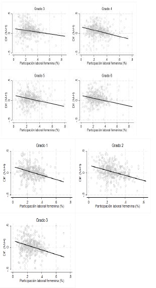 Para el nivel de primaria la hipótesis de que a mayor tasa de participación laboral femenina las niñas deben destinar más tiempo al desempeño de otras actividades, y por ello descuidan sus estudios, se desecha, ya que se encontró una relación positiva entre la tasa de participación laboral femenina y la brecha de género, en el promedio en los resultados de español.24 En el resto de los niveles educativos la relación entre los resultados de español y la tasa de participación laboral femenina es negativa. Por lo que los resultados proporcionan evidencia de que la mayor tasa de participación laboral de las mujeres en el municipio parece estar perjudicando los resultados académicos de las niñas.