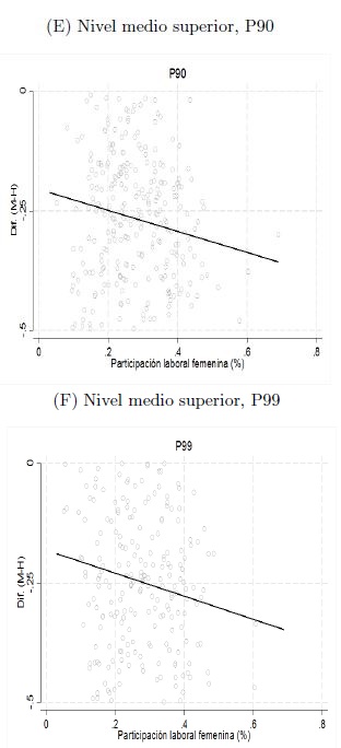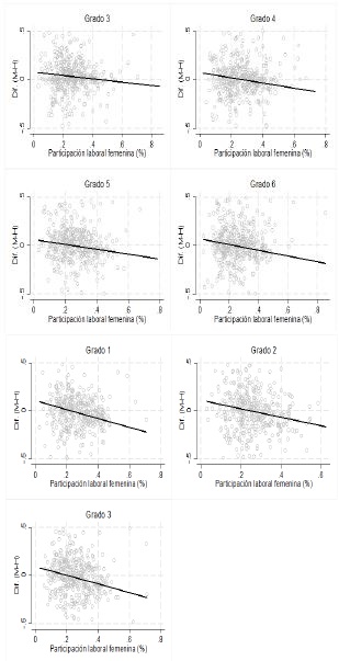 Otra variable que consideramos que puede influir en la explicación de la brecha observada es la tasa de participación laboral femenina. Específicamente, esta variable puede actuar de tres maneras diferentes. Una opción es debido al posible rol de las madres, esto es, como se observa que las mujeres trabajan, las niñas valoran el trabajo de tal forma que desean trabajar en el futuro y desarrollan en mayor medida sus habilidades. Con la misma idea que la anterior, pero en dirección opuesta, como el trabajo desempeñado por las mujeres no requiere de habilidades matemáticas, ellas no valoran el desarrollo de esas habilidades. La otra posibilidad es que dado que las mujeres de sus municipios trabajan, las niñas deben destinar más tiempo al cuidado de sus hermanos o al desempeño de labores domésticas, por lo que descuidan sus estudios.