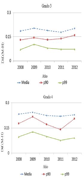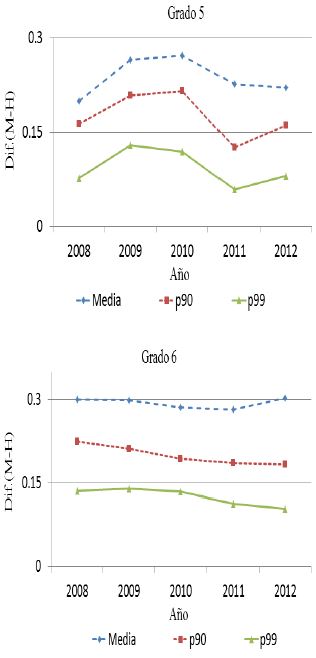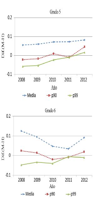 En primaria la brecha en el promedio entre cada grado se ha mantenido relativamente estable a lo largo del tiempo. La excepción ocurre para matemáticas en el sexto grado. Específicamente, entre los años 2008 y 2011 la brecha de género en la media se redujo cerca de 0.09 desviaciones estándar. No obstante, en 2012 aumentó nuevamente 0.06 desviaciones estándar respecto a la diferencia observada en en el año 2011.