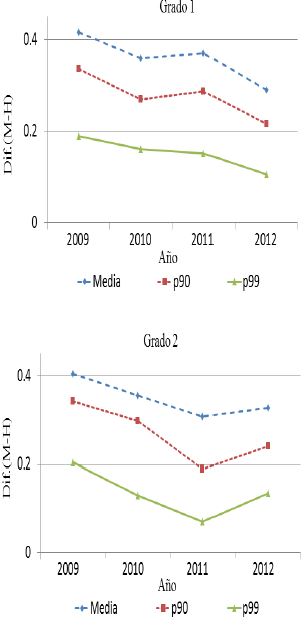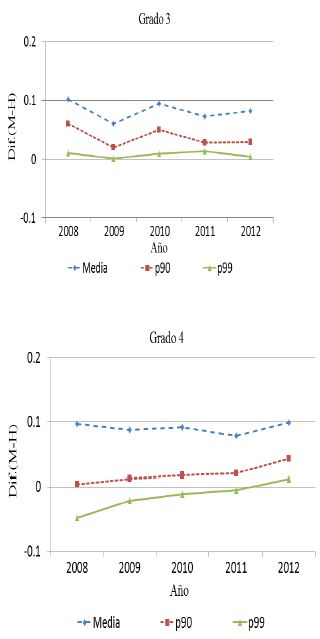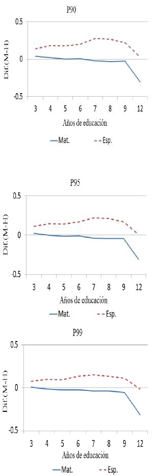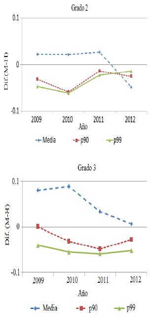 Para la parte alta de la distribución, es decir, del percentil 90 en adelante, el patrón observado en el resto de la distribución se mantiene para la materia de español. Es decir, se observa una ventaja en el puntaje para las niñas en todos los grados, ampliándose esta brecha en la secundaria y reduciéndose en el nivel medio superior. Incluso, en el percentil 99 de la distribución, en los resultados de español los niños aventajan en puntaje a las niñas, una diferencia de 0.012 desviaciones estándar.