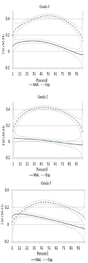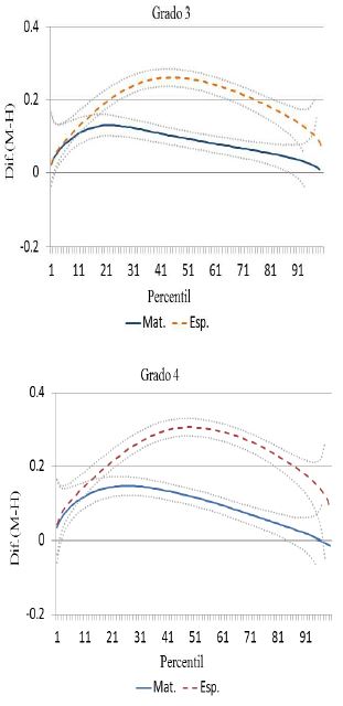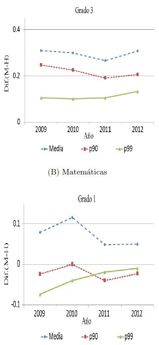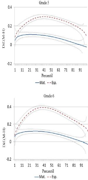 En tanto que para la materia de matemáticas, con excepción del percentil 90, la ventaja es para los niños después del tercer grado de primaria. No obstante, la brecha se mantiene en niveles menores de 0.05 desviaciones estándar hasta la secundaria. Para nivel medio superior la brecha en matemáticas, con ventaja para los niños, se amplía significativamente hasta llegar a ser de casi 0.32 desviaciones estándar.