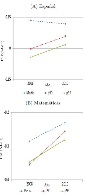 En el nivel medio superior, entre los años 2008 y 2010, la brecha de género en el promedio se redujo en matemáticas. Lo que concuerda con lo hallado por Hyde et al. (2008), Guiso et al. (2008) y Else-Quest, Hyde y Linn (2010), sobre un cierre de brechas en matemáticas. Lo mismo sucedió con la brecha en español. En general, lo encontrado es que las brechas de género en matemáticas al final de los niveles educativos se ha reducido en los años recientes.