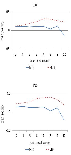 En la Gráfica 1 se muestra la diferencia de género en el puntaje en la media y algunos percentiles de la distribución en función de los años de escolaridad. Se puede observar en ella que el comportamiento en la distribución es diferente en cada percentil. En particular, en el percentil 1 de la distribución la ventaja para las niñas en los resultados de las pruebas de conocimiento ocurre en ambas materias hasta la secundaria. Adicionalmente, en el nivel de primaria la brecha en ambas materias es muy similar, para sexto grado es de 0.09 y 0.07 desviaciones estándar para español y matemáticas, respectivamente.