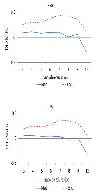 Para la materia de matemáticas entre los percentiles 1, 25, 75 y en la media, la diferencia en el puntaje entre niñas y niños muestra una ventaja para las niñas en todos los grados hasta secundaria. No obstante, para los percentiles altos, la brecha en matemáticas, en general, presenta una ventaja para los niños y esta es muy pequeña hasta secundaria, lo que coincide con lo encontrado en la literatura sobre el cierre de brechas en matemáticas: Hyde et al. (2008), Guiso et al. (2008) y Else-Quest, Hyde y Lin (2010). Mientras que en el nivel medio superior la brecha en matemáticas se amplía de manera sustancial y muestra una ventaja para los niños.