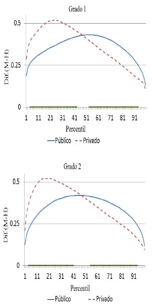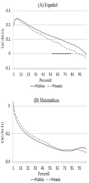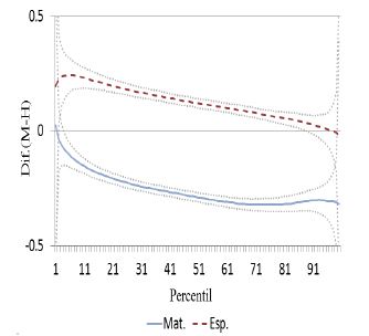 En el nivel medio superior la brecha de género entre los tipos de escuela es muy similar. Respecto a los resultados de español, solo se encontró que la diferencia en la brecha de género entre los tipos de escuela es significativa entre el percentil 53 y 82, donde las escuelas privadas presentan mayores brechas de género respecto a las observadas en las escuelas públicas. Para la materia de matemáticas, por su parte, la brecha de género observada en las escuelas públicas y privadas es estadísticamente la misma.