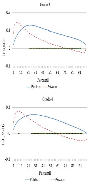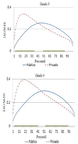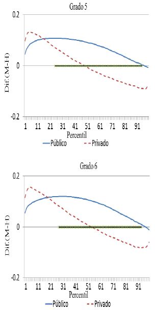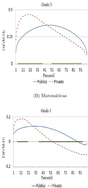 Adicionalmente, se puede observar que en matemáticas la brecha entre géneros con ventaja para las niñas, para los alumnos de escuelas particulares decrece más rápido que la brecha para español. De tal forma que, a partir del tercer grado de primaria, después del percentil 73 de la distribución, los niños superan a las niñas en los puntajes de las pruebas. Mientras que para las escuelas públicas, cuando esto llega a suceder en secundaria, es después del percentil 88. Además, las escuelas privadas mantienen brechas con ventaja para los niños a lo sumo de 0.13 desviaciones estándar. En tanto que en las escuelas públicas, la brecha, como máximo, es de 0.03 desviaciones estándar, con ventaja para los niños.
