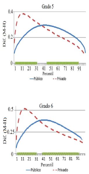 Esto también puede explicarse porque los hogares con mayor nivel socioeconómico tienden a comprometerse, en mayor medida, con las actividades típicas de género, donde los niños juegan con videojuegos o juguetes de construcción que ayudan a desarrollar las habilidades matemáticas (Miller y Halpern, 2014). Otra explicación es que, las mejores niñas de escuelas particulares, cargan, en mayor medida, con el estereotipo de que las mujeres no tienen buenas habilidades en matemáticas y, por tanto, relajan el estudio de la materia desde edades tempranas (para escuelas privadas se observa desde tercer grado de primaria); de tal manera que los mejores niños las superan en el puntaje (Else-Quest, Hyde y Linn, 2010; Reilly y Brucki, 2012; Miller y Halpern, 2014).
