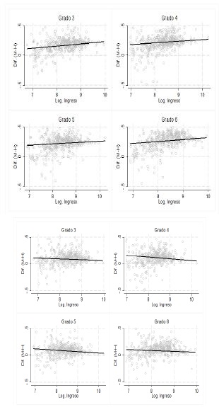 Los resultados de las pruebas de matemáticas en primaria presentan una relación negativa entre el ingreso del municipio y la ventaja de las niñas en las pruebas. Los efectos estimados entre las variables están entre -0.026 y -0.01 desviaciones estándar y son estadísticamente significativos a 1%. Específicamente, se espera que el incremento de 1% en el ingreso per cápita del municipio disminuya en promedio 0.019 desviaciones estándar, la ventaja en el puntaje de las niñas en el sexto grado de primaria. Esto significa que, en el promedio, la ventaja de las niñas en matemáticas se ve disminuida conforme se incrementa el ingreso per cápita en el municipio.