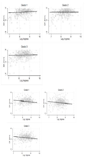 En secundaria se mantiene la misma relación negativa entre las variables, sólo que el efecto del ingreso per cápita en el municipio es mayor. En todos los grados el efecto en la brecha de género es estadísticamente significativo a 1%, específicamente, se espera que se reduzca la ventaja de las niñas en 0.039 desviaciones estándar para el tercer grado al aumentar 1% el ingreso per cápita en el municipio. Mientras que para el nivel medio superior encontramos que al aumentar 1% el ingreso per cápita del municipio se espera que, en promedio, disminuya en 0.021 desviaciones estándar la ventaja de las niñas. Esto nos proporciona evidencia de que, en el promedio, el ingreso del municipio tiene sus mayores efectos en la brecha de género, en cuanto a los resultados de matemáticas en el nivel secundaria.