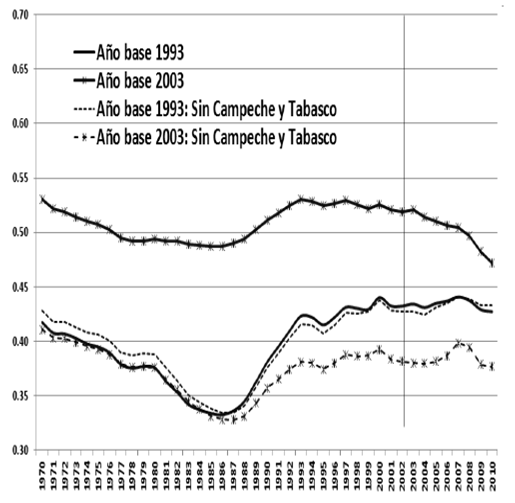Con el objetivo de analizar si los procesos de convergencia y divergencia sigma dependen de la sobrestimación del papel del petróleo en economías como Campeche y Tabasco, que se volvió más evidente con la nueva contabilización del PIB base 2003, se estimaron las desigualdades con el PIB año base 1993 y 2003 para treinta entidades, sin considerar Campeche ni Tabasco.