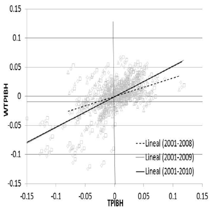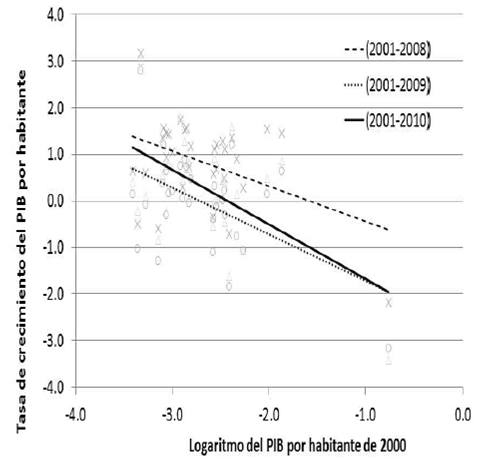 Con la hipótesis anterior como punto de partida, en la Gráfica 3 se presenta la relación entre tasa de crecimiento del PIB por habitante, por región, con respecto al tamaño de cada región, medido por el logaritmo del PIB por habitante del año 2000. Como muestra la pendiente de la línea de relación del periodo de 2001-2008, la dinámica regional se caracterizó por la tendencia decreciente de economías líderes, como Campeche y Baja California Norte y el mayor crecimiento de economías regionales medias, como San Luis Potosí, Yucatán, Sinaloa, Zacatecas y Veracruz, más que por el avance de las economías más pobres del país, como Chiapas, Oaxaca y Guerrero. Con la crisis económica de México en el año 2009 el PIB nacional se redujo en 6.2% y el PIB por habitante en 7.8%, la mayoría de las economías regionales sufrieron una contracción importante de su producción, pero destacan por su magnitud tres fronterizas: Coahuila, Tamaulipas y Nuevo León.