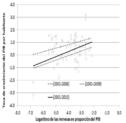 El marco analítico anterior es muy relevante debido a que el periodo para analizar el impacto de las remesas en el crecimiento económico regional tiene como punto de partida el año 2001, donde se puede asegurar que el crecimiento económico nacional nulo de 20012010 se acompaña con un nuevo proceso de convergencia regional si se utiliza el PIB base 2003 y de convergencia sigma débil si se considera la misma serie, pero sin Campeche y Tabasco.