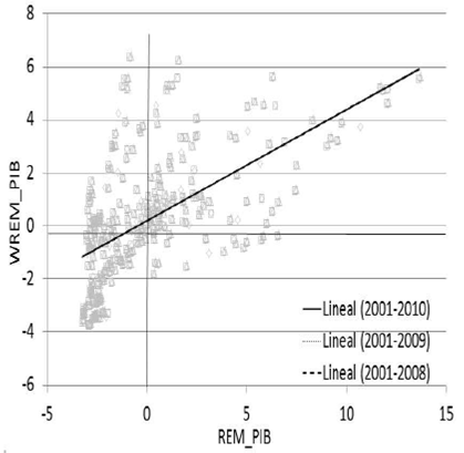En cambio las remesas como proporción del PIB explican en segundo término el crecimiento económico regional con convergencia para el periodo 2001-2008, conviertiéndose en fuente de explicación del crecimiento económico del periodo de crisis y recuperación económica.