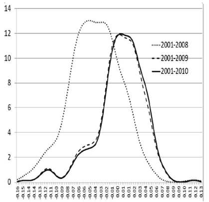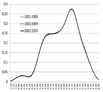 Con el objetivo de analizar mejor los patrones de crecimiento regional y de las remesas como proporción del PIB se calcularon las funciones de densidades kernel gausianas para los periodos 2001-2008, 2001-2009 y 2001-2010. Los resultados indican que para el periodo de auge económico 2001-2008 el crecimiento económico regional tuvo un patrón de concentración normal: el grupo de crecimiento acelerado, el grupo de crecimiento lento y el grupo más grande con una dinámica promedio (ver Gráfica 7). Con la crisis económica y aún durante el periodo de recuperación económica el crecimiento regional se caracterizó por un patrón muy diferente al observado en el periodo previo. En particular, se observan tres concentraciones o modas que muestran claramente un grupo de entidades creciendo por arriba del promedio y dos grupos de entidades con tasas de crecimiento por debajo del promedio y en el extremo inferior. En especial, se advierte que el patrón de crecimiento regional del periodo de crisis y recuperación económica tiende a ser el mismo que han tenido las remesas como proporción del PIB que se muestra en la Gráfica 8. Las remesas tienen un impacto muy alto en un conjunto de entidades concentradas, pero también se encuentran entidades concentradas con niveles de remesas a PIB promedio y de relevancia muy baja.