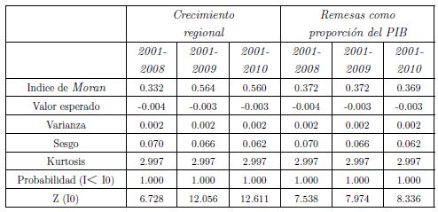 El objetivo del análisis exploratorio con el índice de Moran global, jmoran , es revisar si existe evidencia de dependencia espacial en el crecimiento regional y en las remesas como proporción del PIB, para los periodos 2001-2008, 2001-2009 y 2001-2010. Los resultados del cálculo del jmoran indican que el crecimiento económico regional se acompaña con una gran dependencia espacial para todos los periodos de análisis, pero también muestra que tal dependencia se incrementó durante la crisis económica de 2009 y se mantuvo igual en el periodo de recuperación económica de 2010. De un jmoran de 0.33 en el periodo 2001-2008 paso a 0.56 para los periodos 2001-2009 y 2001-2010. Para el caso de las remesas como proporción del PIB, el jmoran es prácticamente el mismo para los tres periodos (0.37) y muy parecido a la dependencia del crecimiento regional para el periodo previo a la crisis económica. En todos los casos los estadísticos relacionados a los momentos del jmoran muestran que son altamente significativos.