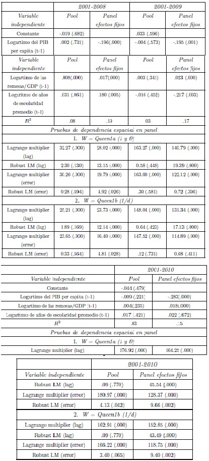 Sin embargo, los resultados de esta estimación también muestran que en los momentos de crisis y recuperación económica el crecimiento regional no se puede explicar por los años de escolaridad, ni por la remesas como proporción del PIB. Los estadísticos (LM) y LM robustos indican que existe evidencia de que las estimaciones con ols tienen una dependencia espacial de los dos tipos y la R2 es muy pequeña.