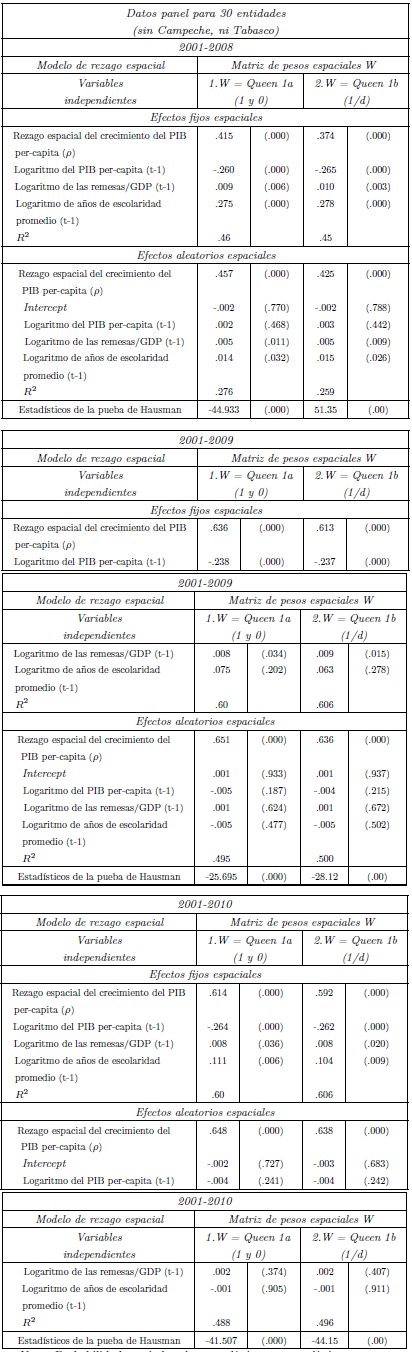 Para analizar si la sobrestimación del papel del petróleo en economías como Campeche y Tabasco está condicionando las conclusiones previas sobre convergencia β, como las de los efectos de las remesas y los años de escolaridad sobre el crecimiento económico regional, se estimaron los modelos de rezago espacial con efectos aleatorios y fijos para la muestra de 32 entidades federativas (sin Campeche ni Tabasco) y los tres periodo de análisis.