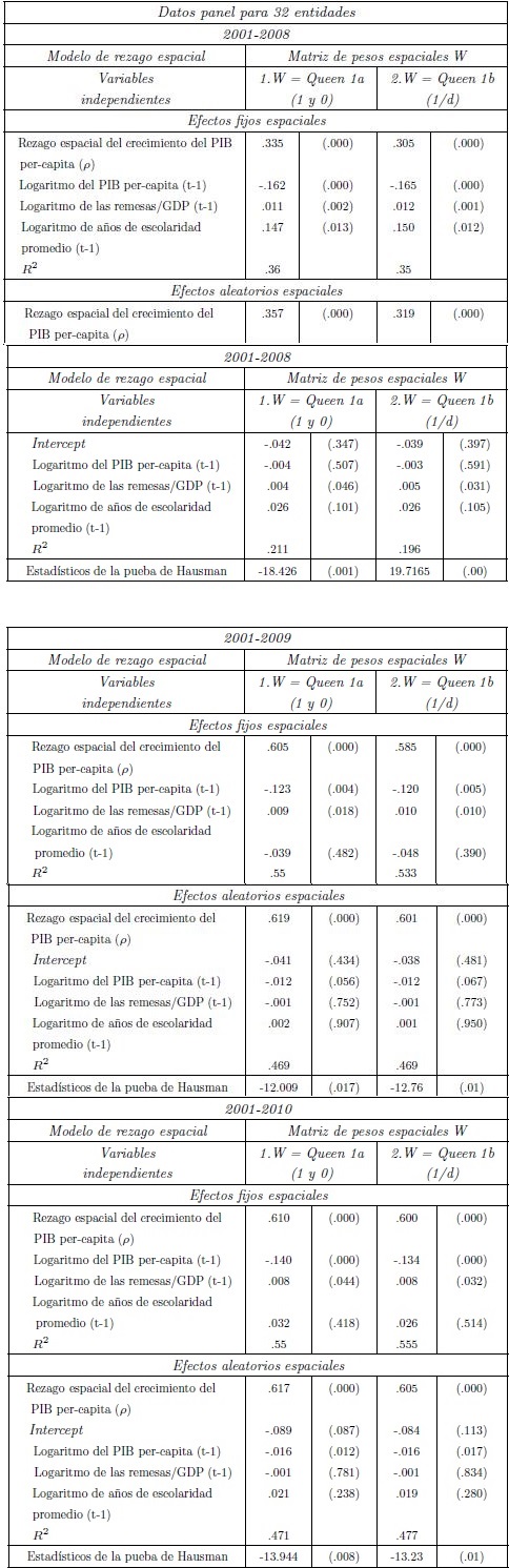 El trabajo de Valdivia y Lozano (2010) también estudia el efecto de las remesas en el crecimiento económico regional para el periodo 1995-2006, con un enfoque espacial establece que las remesas como proporción del PIB muestran una polarización hacia regiones con ingreso por habitante bajo y medio, con un crecimiento económico mayor, pero donde muchas de las entidades no forman parte de las regiones migratorios tradicionales y más bien ahora se localizan en el sur del país. Los autores utilizan una versión modificada del modelo de crecimiento económico con convergencia regional de corte transversal para incluir dependencia espacial, que se conoce en la literatura econométrica como modelo de rezago espacial. Los resultados de las estimaciones para diferentes periodos y combinación de variables indican que las remesas siempre tienen un efecto positivo en el crecimiento económico regional, sin embargo, los autores reconocen que el parámetro no siempre es significativo y los resultados no siempre son consistentes al analizar conjuntamente con las otras variables de los modelos, en especial con el proceso de convergencia. Por ejemplo, los modelos no espaciales aplicados para los periodos 1995-2006 y 2001-2006 muestran que las remesas tienen un efecto positivo en el crecimiento económico regional, pero debido a que el parámetro de convergencia-β es positivo estaría indicando un proceso de divergencia económica, y desde el punto de vista analítico no es consistente con el efecto esperado de las remesas. Cuando se estima el modelo de rezago espacial para el periodo 2001-2006 al resultado empírico anterior se le añade el dilema de que las remesas no son significativas. La estimación de modelo de crecimiento regional no espacial para el periodo 2003-2006 muestra un proceso de convergencia económica regional, donde las remesas tienen un impacto positivo pero son no significativas.