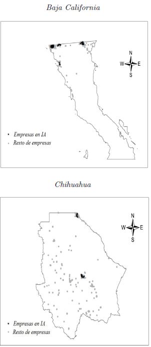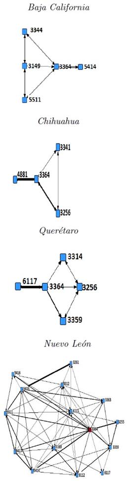 Según se observa en la figura, Nuevo León no solo cuenta con el mayor número de ramas relacionadas espacialmente a la IA (en relación con las otras entidades analizadas) sino que también, entre estas mismas, existe una compleja vinculación espacial, lo cual se relaciona con el desarrollo económico de la entidad y con su sistema industrial maduro. En Baja California, por su parte, vemos como los sectores fabricantes de componentes electrónicos (SCIAN 3344) y de corporativos (SCIAN 5511) relacionados a la IA, muestran una probabilidad bidireccional de instalarse en las cercanías del sector fabricante de productos textiles (SCIAN 3149); mientras que en Querétaro destaca un patrón similar desde la industria de metales no ferrosos (SCIAN 3314) y los fabricantes de equipos y accesorios electrónicos (SCIAN 3359) hacia los fabricantes de adhesivos industriales (SCIAN 3256); finalmente, en Chihuahua este último sector muestra un patrón de co-locación bidireccional con los fabricantes de computadoras (SCIAN 3341).