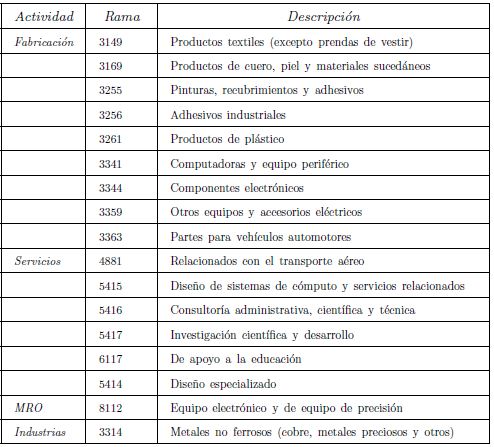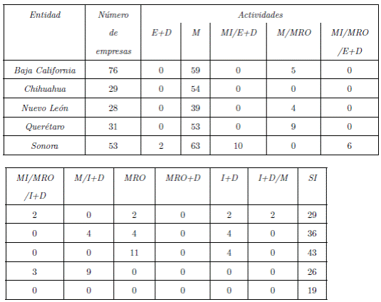 Esta relación espacial, principalmente con ramas de manufactura, se corresponde con el patrón productivo que a nivel nacional presenta la industria. Así, observamos que la manufactura (M) es la principal actividad realizada por el sector, donde destaca la fabricación de arneses y cables, componentes de motores, sistemas de aterrizaje, inyección de plásticos y molduras, sistemas de audio y video, aislamientos de fuselajes, composturas, intercambiadores de calor, maquinado de precisión, software de control de producción y conjuntos estructurales y electrónicos. A esta actividad le sigue en importancia el mantenimiento, reparación y revisión (MRO), especialmente de turbinas y motores, fuselajes, sistemas eléctricos y electrónicos, sistemas de aterrizaje, hélices y álabes, componentes dinámicos, cubrimientos, corrosión y protección, vestiduras y equipos para interiores, pruebas no destructivas, así como para unidades de potencia auxiliar. Para finalizar, y en menor medida, se encuentran las actividades de investigación y desarrollo (I+D) dirigidas hacia el área de aerodinámica, sistemas de control y calidad, instrumentación, pruebas no destructivas, simulación de vuelos, procesamiento de datos e imágenes, diseño de equipo y respecto a sistemas de información empresarial (Cuadro 5) (FEMIA, 2012; ProMéxico, 2013b).