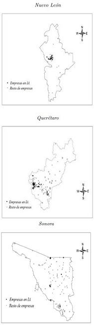Destaca en el análisis el caso de Nuevo León, ya que, a pesar de que no aparece en el plan nacional de vuelo de ProMéxico (2014) como una de las entidades más destacables en términos de esta industria (en cuanto a número de unidades económicas pertenecientes al sector en su territorio, empleos generados y valor de la producción derivada del mismo), tiene el mayor número de sectores productivos con patrones de co-locación, lo que se relaciona con su sistema industrial maduro. Así también, pero en sentido contrario, sobresale el caso de Sonora, entidad que, a pesar de tener el segundo lugar a nivel nacional en relación con el número de unidades económicas pertenecientes a la IA instaladas en su territorio, no muestra sectores productivos con patrones de colocación respecto a dicha industria, lo cual está relacionado con los incentivos iniciales (basados en cercanía geográfica con Estados Unidos y disponibilidad de capital humano) que tiene la industria para instalarse en este territorio.