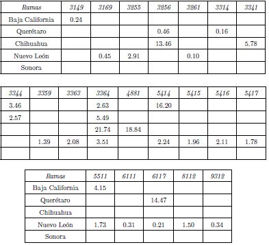 Es destacable también, que esta entidad cuenta con la mayor cantidad de sectores con patrones de co-locación respecto a la IA, no obstante, los valores obtenidos por el estadístico son de baja magnitud, ya que mientras Nuevo Léon tiene como valor máximo un CLQ3364→3364 = 3.51, en otras entidades se pueden observar valores máximos superiores a CLQx→y > 10; lo que tiene su explicación en la sensibilidad del estadístico utilizado y el número de ramas comprendidas en el patrón de co-locación.