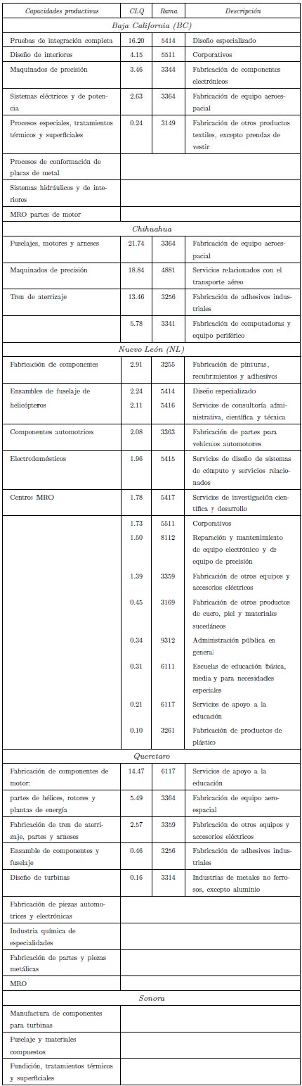De entre las capacidades destacadas para Chihuahua, relacionadas con la IA, se encuentran las actividades de fabricación de arneses y placas metálicas, botes de evacuación y tanques de gasolina para aeronaves, ensambles electrónicos, termógrafos, equipos de frecuencia de radio, sistemas de encendido de motores (Boeing) y partes de turbinas (estructuras, componentes estáticos, impulsores, navajas, engranes) (ProMéxico, 2012c; Carrillo y Hualde, 2013). Al observar los resultados obtenidos, mediante la utilización del estadístico CLQ, se corrobora la relación espacial de estos sectores con la IA, se adiciona únicamente a los servicios relacionados con el transporte aéreo y el de preparaciones para tocador.