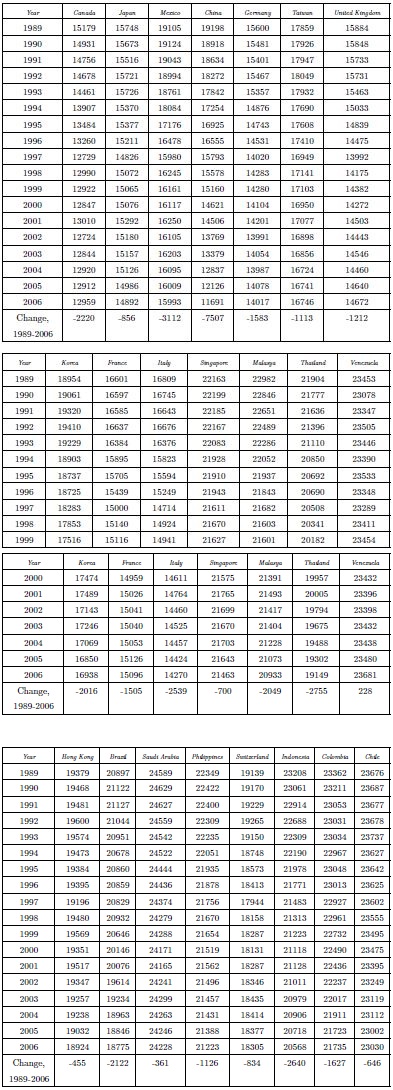 The order of the countries in the table represents the ranking of exports into the US over this period, except Colombia (ranked 29) and Chile (ranked40).5 Mexico ranks number three following Canada and Japan. There were 19 105 zeros in 1989, which decreased to 15 993 in 2006. The last row in Table 1 shows the reduction in zeros during the investigated period. The number for Mexico (-3112) is second only to China, a huge country that is rapidly and dramatically increasing its exports across the world. In this sense, China can be considered to be an exceptional case. Mexico had more zeros, or non-exported items, than Korea and Taiwan in 1989. In 2006, the opposite was true. In other words, Mexico has surpassed Korea and Taiwan in terms of the variety of its exports to the US, and is close to the level of France.