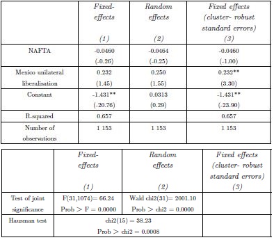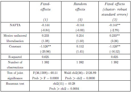 where i represents origin (exporter) countries and t represents years. Year is a vector of the year dummies, and Country is a vector of country dummies. The Fisher export variety indexes are computed for the 50 largest exporters to the US market for the maximum period of 35 years (1972-2006), thus giving 1 392 observations,17 as in Table 10. The estimation results for the period of 1972-2006 are in Table 10. The first column shows the fixed-effects estimator, and the second column the random effects estimator. The Hausman test’s null hypothesis that the random effects estimator is consistent is rejected, leading us to take the fixed effects as the appropriate estimator. The NAFTA dummy shows a statistically insignificant coefficient estimate. To address possible heteroskedasticity and/or autocorrelation of errors, the third column shows the estimates with cluster-robust standard errors. Notably, the NAFTA dummy has a statistically significant negative coefficient, -0.144, whereas the Mexico unilateral liberalisation dummy shows a statistically significant positive coefficient, 0.233, which is in line with the econometric analysis using raw trade data in section 2.