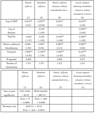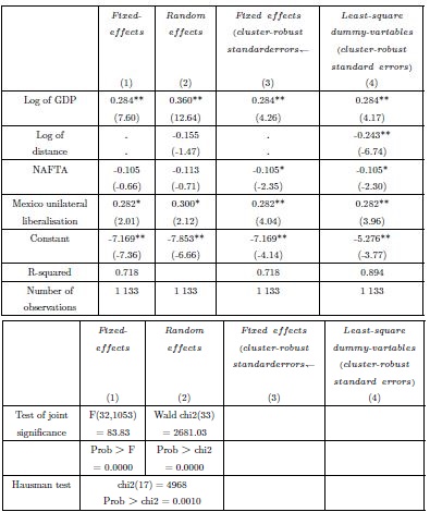 The same estimation is presented in Table 11 with the period limited to 2001 to make it comparable with the findings of Feenstra and Kee (2007). The NAFTA dummy in the third column becomes insignificant while the Mexico unilateral liberalisation dummy shows a statistically significant positive coefficient, 0.232, which is very close to 0.233 in Table 10. In addition to this benchmark model, we also estimate the model adding the GDP of the origin country and the distance from the origin country to the US. The log is taken for all variables. Table 11 shows the estimation results. The results of the Hausman test lead us to take the fixed effects estimator as the appropriate one. The NAFTA dummy in the fixed-effects (column 1) is statistically insignificant whereas the one in the fixed-effects with cluster-robust standard errors (column 3) shows a statistically significant negative coefficient. The coefficient estimates for the Mexico unilateral liberalization dummy show a statistically positive coefficient both in the column 1 and in the column 3. The last column (column 4) shows the case for the least-square dummy-variables, in order to obtain the coefficient estimate for the distance variable. The case for the years 1972-2001 is in Table 13. The results are qualitatively the same, with a somewhat smaller magnitude for the NAFTA dummy. All the findings in Table 10 to Table 13 are thus at odds with those of Feenstra and Kee (2007).