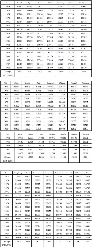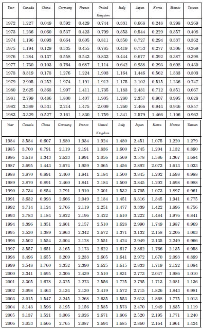 The computed Fisher index for the largest 10 exporters to the US market is shown in Table 8. It is notable that the very low index number for China in 1972 rose sharply toward 2006. For comparison purposes, the variety index computed by the Feenstra and Kee (2007) methodology is shown in Table 9. The notable difference is that China’s index numbers at the beginning of the study period are closer to those of Mexico compared with the Fisher variety index. The difference in the index numbers between Mexico and China is clearly smaller in the original Feenstra and Kee index.