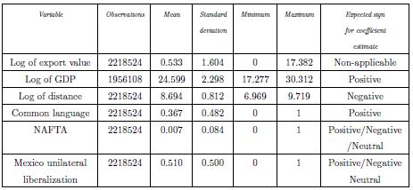 This section performs an econometric analysis using raw trade data to examine whether the probability of a particular product being exported is associated with Mexico’s periods of trade liberalization. As noted in the previous section, it is imperative to use trade data from a sufficiently long period of time before 1986 in order to appropriately capture the effects of the two major series of Mexico’s trade liberalization: the unilateral trade liberalization from 1986 and inception of NAFTA from 1994. It is logically straightforward to assume that NAFTA may have had a positive impact on Mexico’s export variety because the US eliminated its import tariffs on Mexican goods. On the other hand, Mexico’s unilateral trade liberalization was an initiative on the side of Mexico to reduce its import tariffs, and thus did not directly work to reduce its trade partners’import tariffs. However, this initiative may have increased Mexico’s export diversification through two channels.