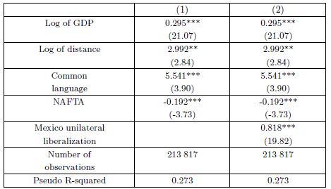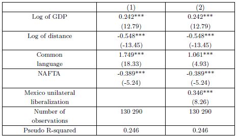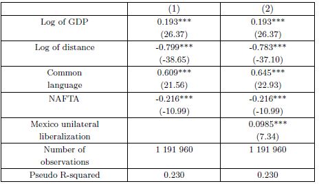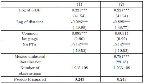 The first channel is due to better access to affordable inputs, which may eventually have led to an increase of export variety. Indeed, the Mexican government’s first action in its series of unilateral trade liberalization was the elimination of license requirements, official import prices, and quantitative restrictions, in order to improve Mexican products competitiveness.9 The other is Mexico’s accession to the General Agreement on Tariffs and Trade (GATT) in 1987, which itself was made possible by Mexico’s unilateral trade liberalization in 1986. We use five-digit SITC trade data, which are the only data available with consistent product codes for a sufficiently long period.10 We use Mexico’s export data on the 50 largest export destinations at the five-digit SITC level for the longest possible date range, namely 1962-2010. The following equation is then estimated using a Probit model: