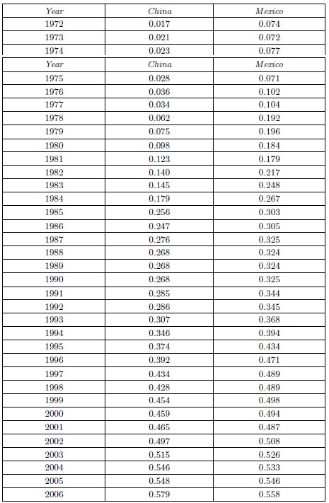 Another problem of using the worldwide exports from all countries to the US, averaged over time, as the comparison base is that the index is distorted by the export values of large exporters. If Mexico increases the variety of its export products by one product, the variety index increases, but the amount of new products exported by Mexico does not matter. Instead, the total amount across countries and averaged over time enters the computation. Thus, an increase in Mexico’s variety index may be caused simply by a substantial increase in China’s export volume to the US rather than by an increase specific to Mexico. Put differently, when Mexico increases the number of export goods from n at time t to n+1 at time t+1 and from n+1 at time t+1 to n+2 at time t+2, the changes in the index are different. More importantly, changes are substantially affected by worldwide exports to the US. As before, we propose using the Fisher index to overcome this problem (see the Appendix for an illustration). As in Feenstra and Kee (2007), the export variety index is computed for 1972-1988 using US import data at the seven-digit code level and for 1989-2006 using US import data at the 10-digit HS code level.16