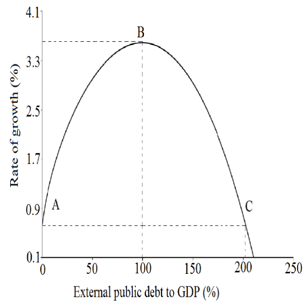 Thus, it has been shown that at low levels of indebtedness, an increase in the external debt to GDP ratio could promote growth; however, with high levels of indebtedness, an increase in the external debt to GDP ratio could hurt economic growth. This theoretical result resembles certain empirical results that have demonstrated a nonlinear relationship between debt and growth.